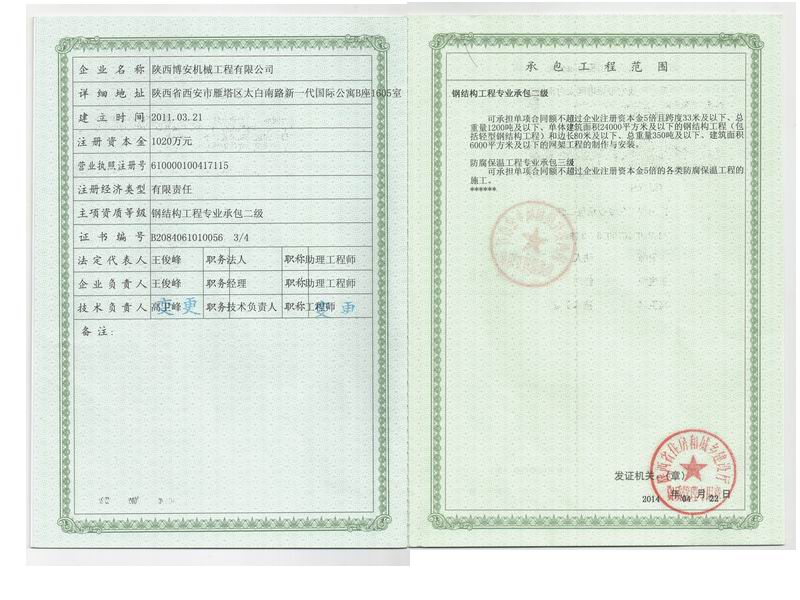 公司介绍:陕西博安机械工程有限公司注册成立于2011年3月,经过不断地发展、完善,现已成为管理机构健全、技术力量雄厚、质量体系完善、检测手段齐全的专业化设计、制造、销售50吨桥面回转吊机、桥梁检查小车、提梁机、运输小车等起重设备和制造、安装钢桥梁的工程公司。 本公司组织机构健全,下设公司西安办公室、武功工业园加工厂。管理机构组织有项目经理部、财务部、技术研发部、工程部、经营部、行政部、采供部、实验室等。